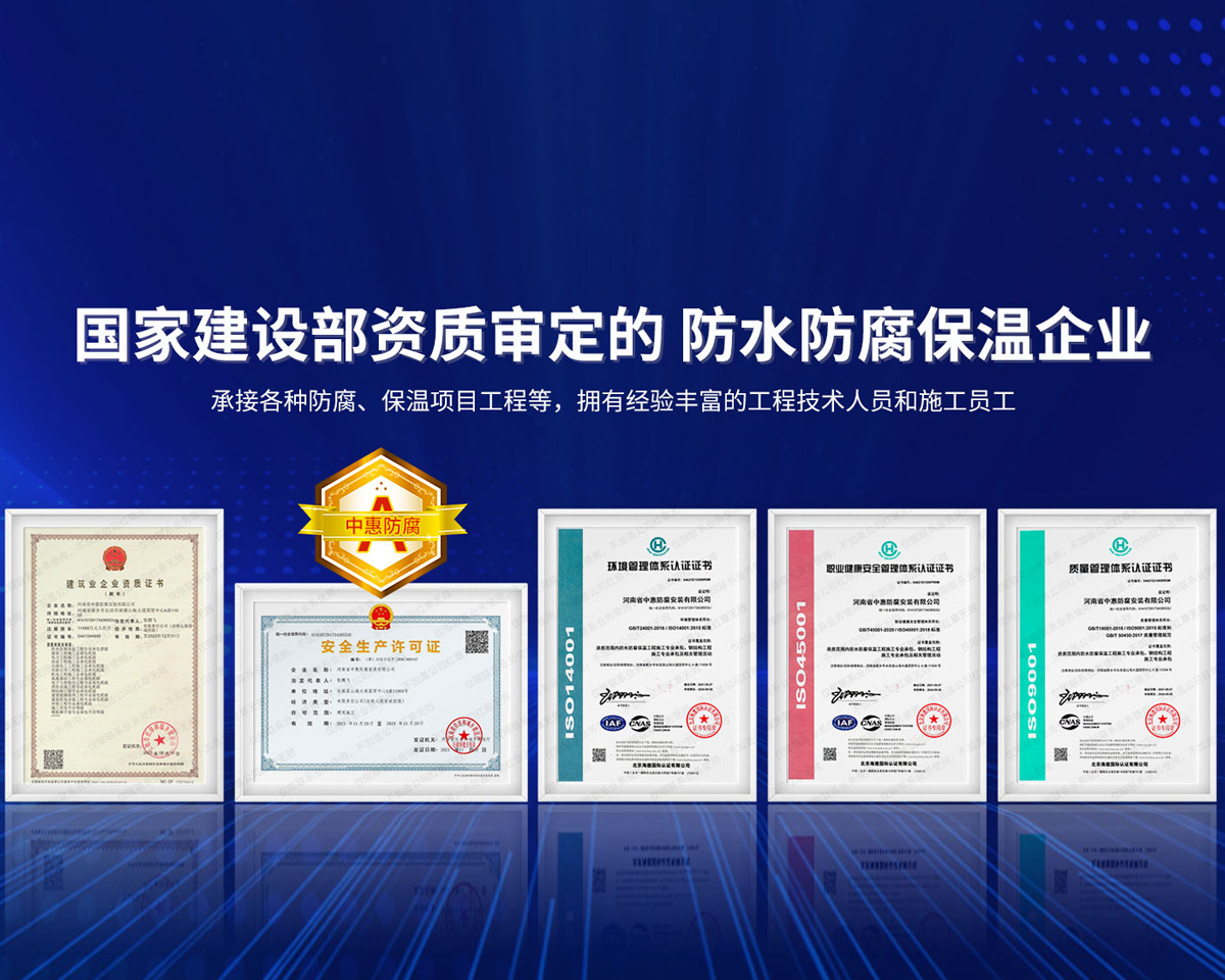 公司經營范圍:防水防腐保溫工程;消防設施工程;建筑裝修裝飾工程;建筑機電安裝工程;電力工程;建筑工程;石油化工工程;工業清洗工程;油罐清洗工程;鋼結構工程;環保工程;模板腳手架工程;電纜防火封堵、防污閃噴涂、外墻外保溫工程;各類施工勞務作業;設備維修、船舶鉚焊、涂裝;電力工程材料、建材、防水材料、防火材料、防腐保溫材料銷售,并相繼通過了GB/T19001-2008idtISO9001:2008GB/T50430-2007質量管理體系認證證書。GB/T24001-2004idtISO14001:2004環境管理體系認證證書。GB/T28001-2011idtOHSAS18001:2007職業健康安全管理體系認證證書。公司是中國防腐蝕于防護協會、中國施工企業管理協會、電力協會和中國鋼結構防水協會會員單位。 公司的經營業務涵蓋了石油、化工、電力、冶金、煤炭、船舶、國防、燃氣、水利、環保、交通運輸、航空及國防軍工和輕紡市政等行業的防腐保溫絕熱設備。鋼結構安裝、防火、防水、金屬噴鍍、聚脲噴繪、陰極保護、防滲透堵漏、玻璃鋼及各種磚版材料襯里、橡膠襯里、煙氣硫和耐酸溶劑腐蝕等工程施工。公司連續十年榮獲“省市先進施工企業”“安全生產先進單位”“重合同,守信用企業”和“AA***資質企業”的稱號。2000年被命名為市級文明單位,2002年被國家工商行政管理局命名為“重合同,守信用的企業”、被中國工業防腐蝕技術協會命名為“防腐蝕企業,能源節約及環境保護領域有豐富的經驗和***的業績。工程一次交驗合格率100%。其中攀枝花鋼鐵公司煉鐵廠四號高爐及熱風爐防腐工程、上海寶鋼公司煤氣柜防腐工程、撫順石油一廠裝置防腐項目、齊魯石化公司稀烴廠高塔防腐工程、吉林化學工業公司煉油廠油罐防腐工程、天津石化熱電廠六號爐頂棚聯絡管保溫工程、大慶油田(太倉)力神泵業工程、中國化學工程第十一建設工程、中原油田勘探局工程、中國石化銷售有限公司華北分部、魯皖輸油管道工程、貴州開磷息烽合成氨工程、陜西黃陵煤化工程、中國石油天然氣西部管道塔里木輸油工程、邯鋼集團邯寶鋼鐵公司煉鐵工程、德州供電工程、吉寶(南通)船廠工程,偃師華潤熱力工程、鄭州熱力總公司。 河南省中惠防腐安裝有限公司愿以豐富的施工經驗,***的技術,***的設備,***的管理,***的服務,竭誠為國內外廣大的用戶提供***滿意、******的工程作品。 我公司愿與國內外同仁一道,團結協作,共同推進防腐蝕行業發展! 公司地址:河南省長垣縣建設路北段360號 固定電話:0373-8866488 郵編:453400 網址:http://www_zhff_com_cn.51caiwa.com